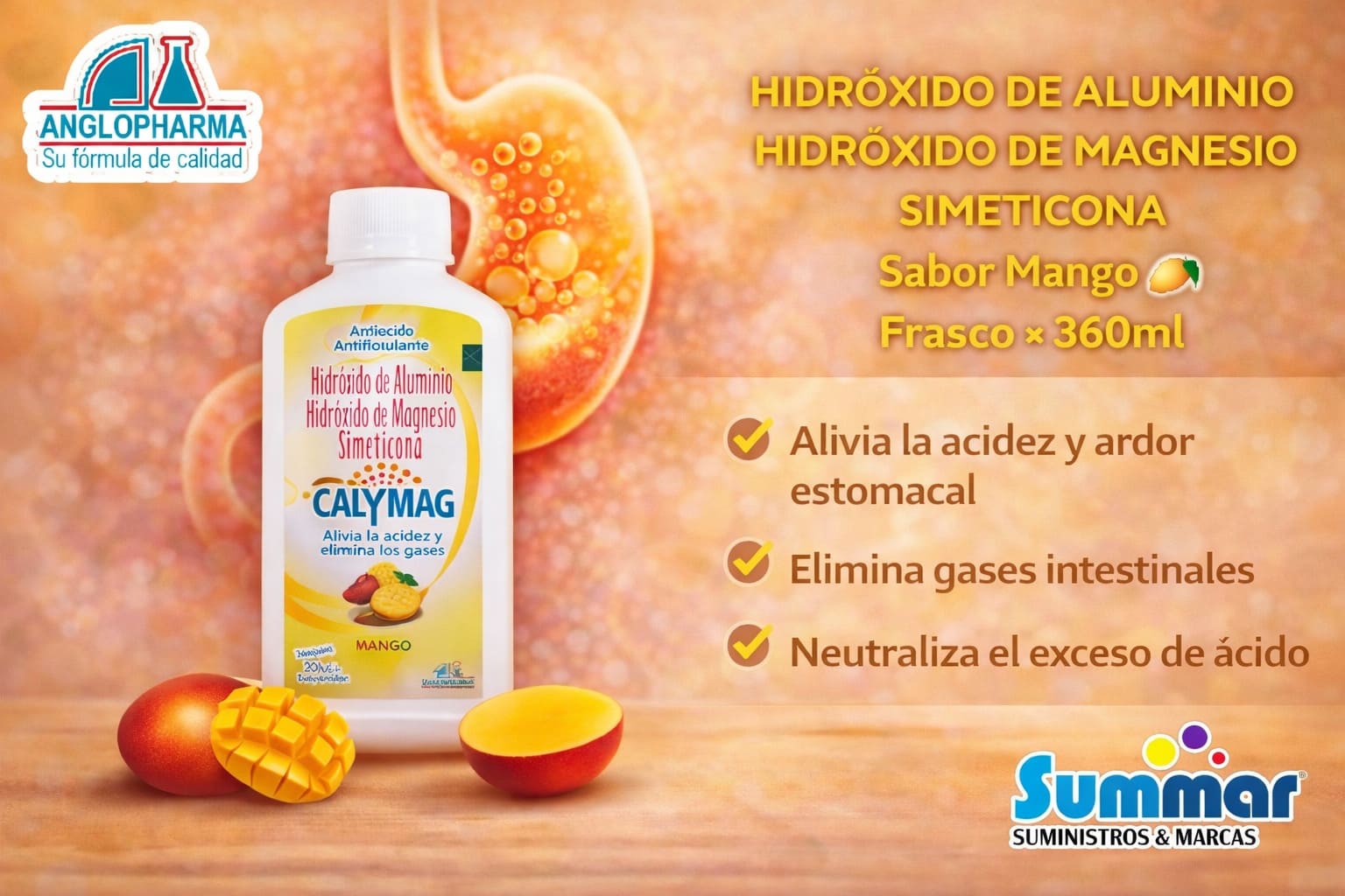 Calymag® Suspensión Melocotón Frasco x 360ml (Hidróxido de Aluminio Aluminio de Magnesio Simeticona) ANGLOPHARMA