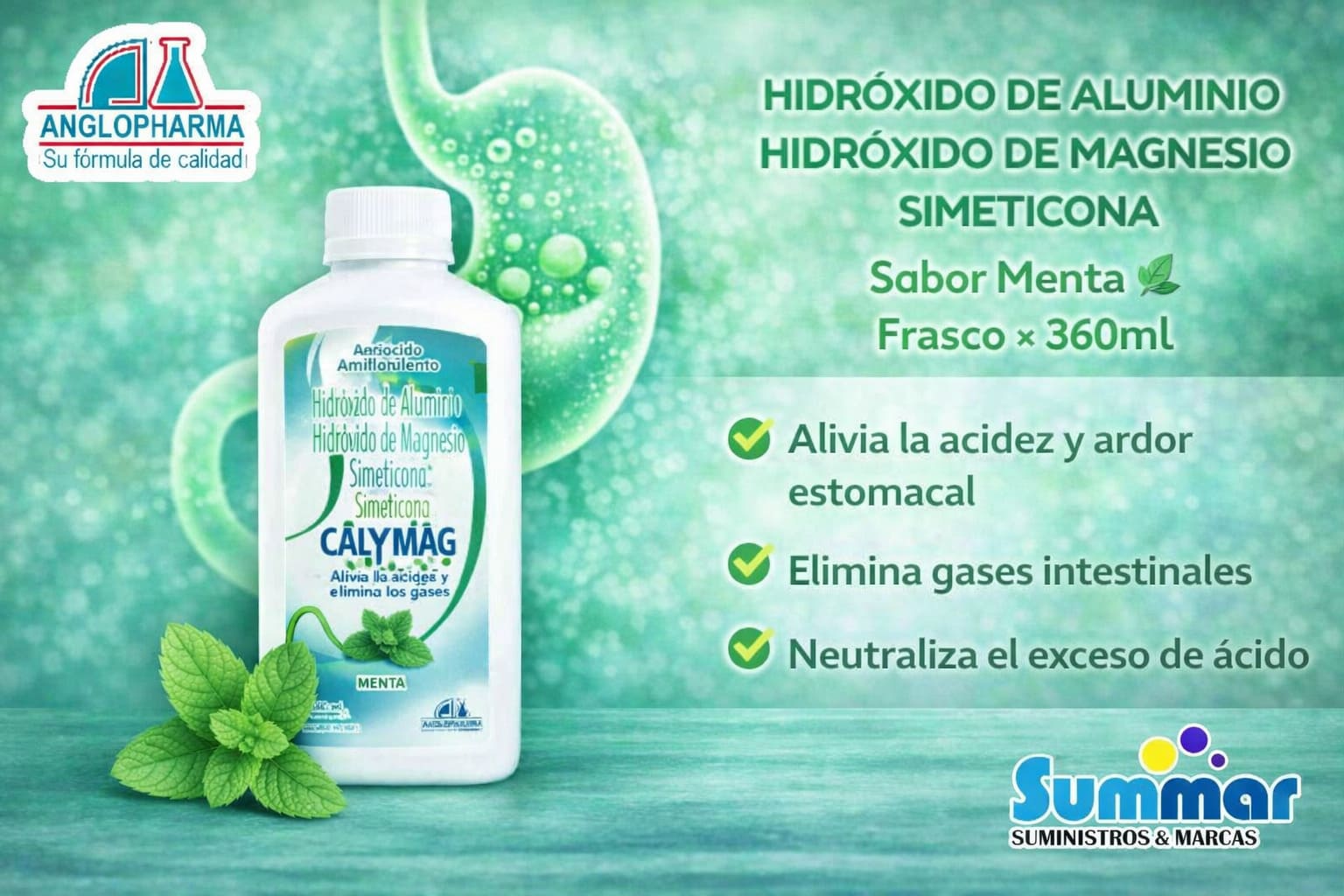 Calymag® Suspensión Melocotón Frasco x 360ml (Hidróxido de Aluminio Aluminio de Magnesio Simeticona) ANGLOPHARMA